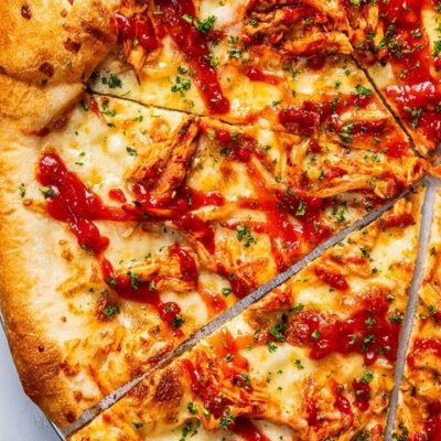 BBQ sauce, BBQ chicken breast, caramelized onion, and mozzarella
