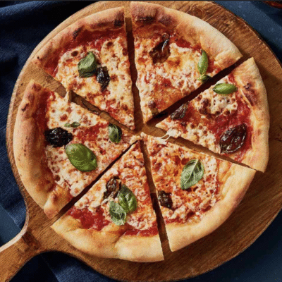 Homemade tomato sauce, vegan cheese, fresh basil, & evoo